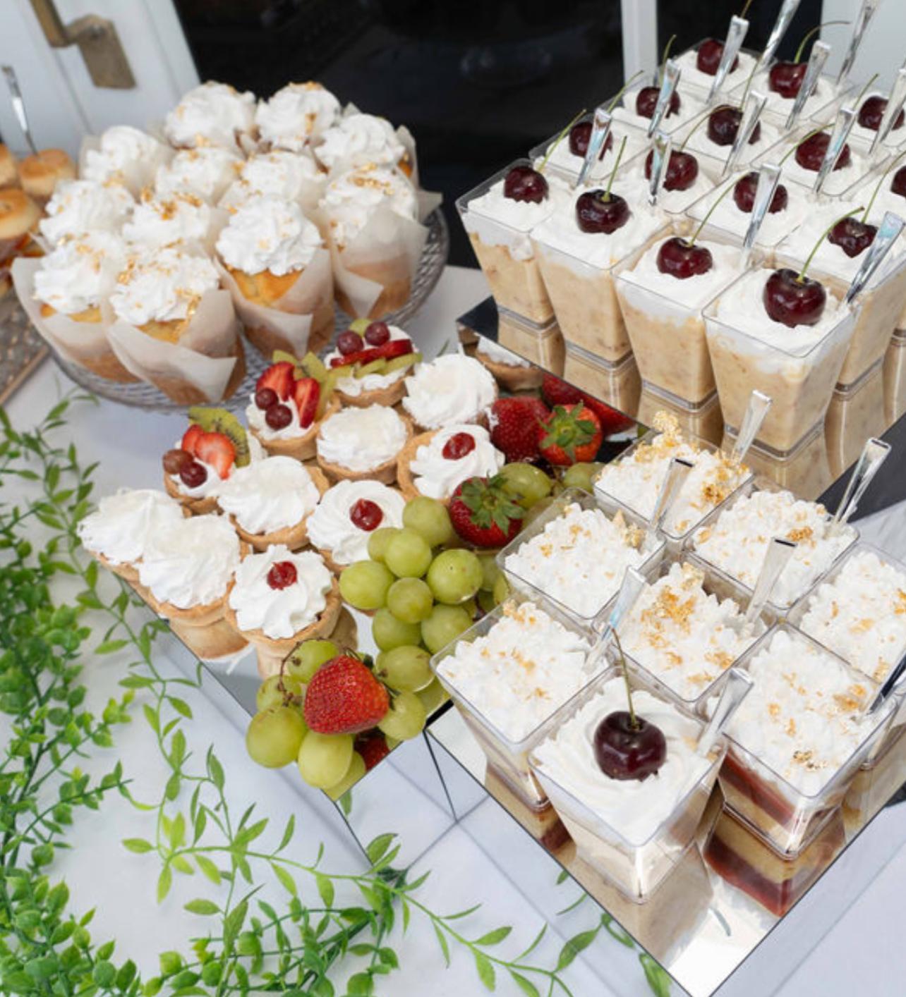 This menu presents a variety of options for an appetizer and dessert table, with prices per serving and choices for large groups. It covers both savory delights, such as charcuterie boards and cheese plates, and a selection of sweets to round out the experience.