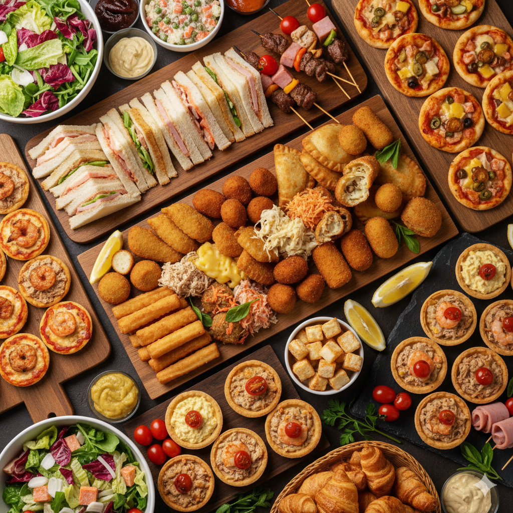This appetizer table menu offers a wide variety of savory finger foods perfect for any event. The selection includes both classic and creative options, from croquettes and empanadas to tequeños and mini pizzas, ensuring there's something to please every palate.